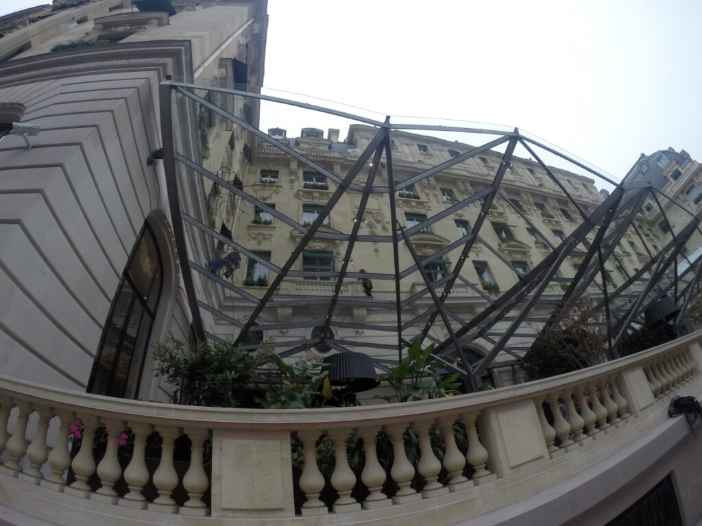 Nettoyage de l’avion « l’Oiseau Blanc » suspendu dans la cour intérieure de l’hôtel Peninsula à Paris